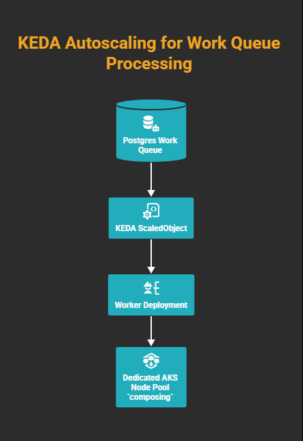 KEDA (Kubernetes Event-Driven Autoscaler) watches an external event source and adjusts replica counts in response. In our case, that source was a Postgres table acting as a prioritized work queue. When rows appeared, KEDA scaled up worker Deployments. When the queue drained, it scaled them back to zero.