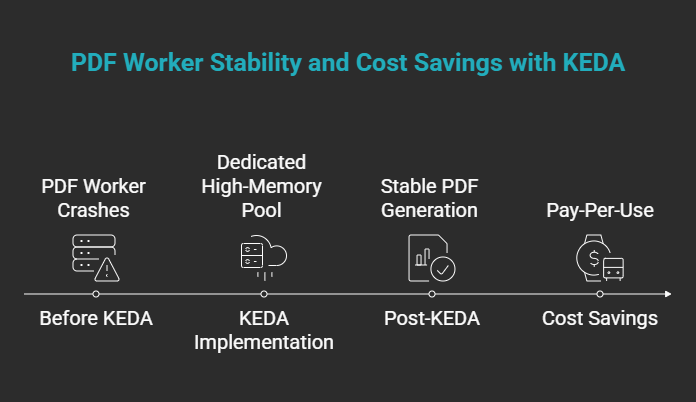 Our PDF workers were crashing mid-job because the nodes didn't have enough memory to finish the work. We moved them to a dedicated high-memory pool. KEDA scales that pool to zero between jobs, so you only pay while work is actually running.