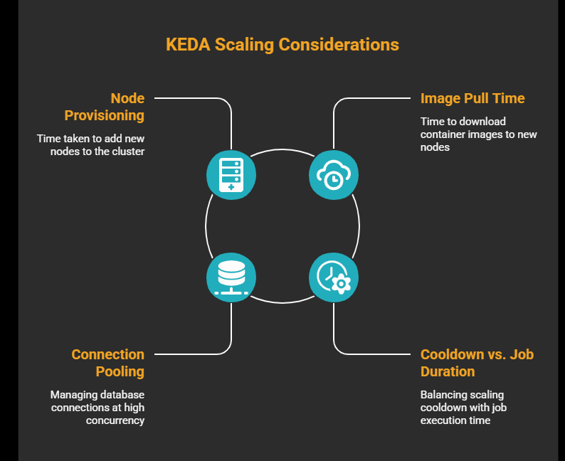 Connection pooling. KEDA queries Postgres every pollingInterval seconds. Your workers also hold queue connections. At low replica counts this is trivial; at higher concurrency, verify you are within your database connection limit.