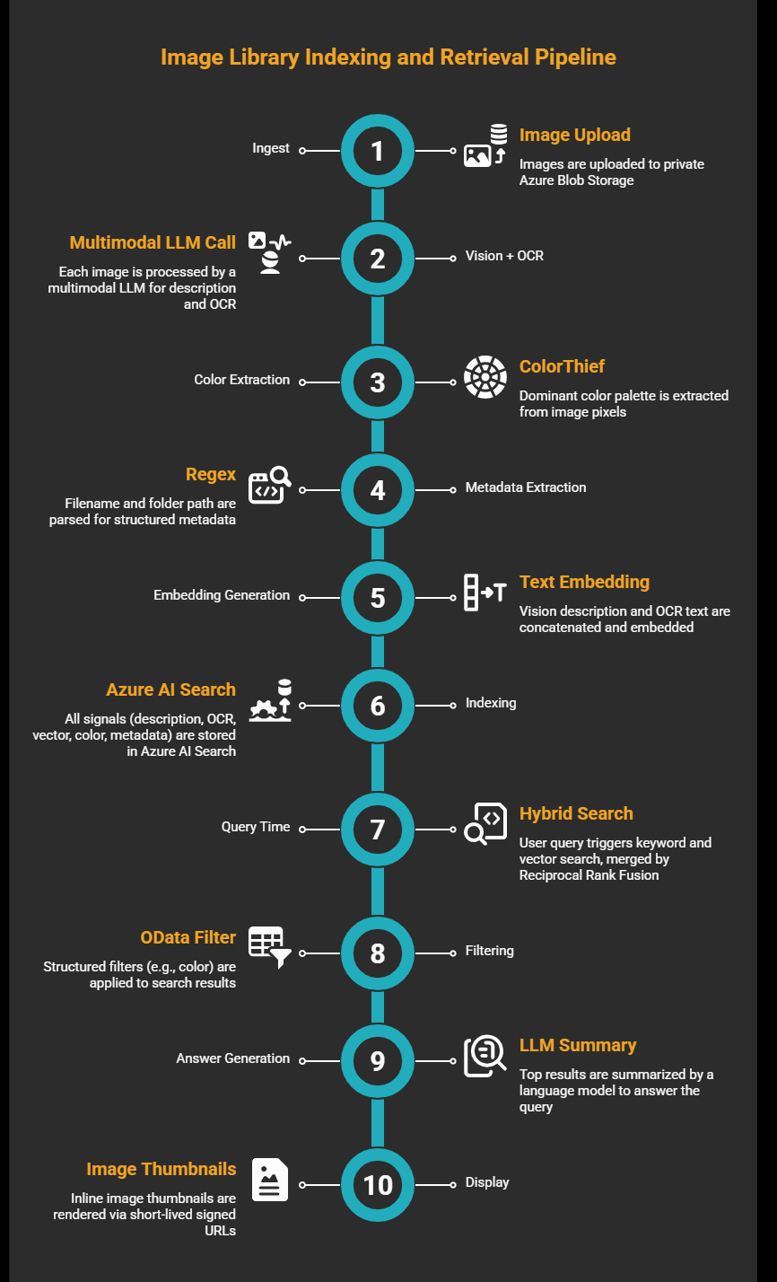 At query time, it's standard text search. The user types a question. The system runs a hybrid query: keyword search and vector search in parallel, merged by Reciprocal Rank Fusion (RRF). If the question implies a filter ("show me blue images"), the system applies a structured OData filter on the color names field. The language model reads the top results and generates a grounded answer. The UI renders inline image thumbnails via short-lived signed URLs (Azure SAS tokens) to the originals.