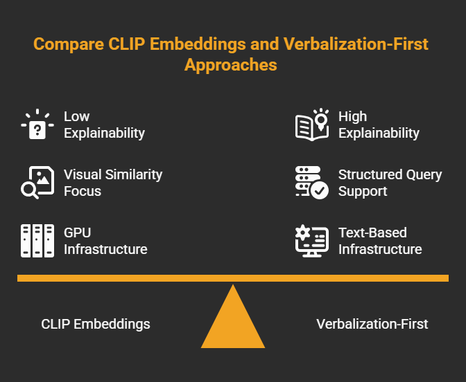 | Criterion | Verbalization-First | Embedding-First (CLIP) |