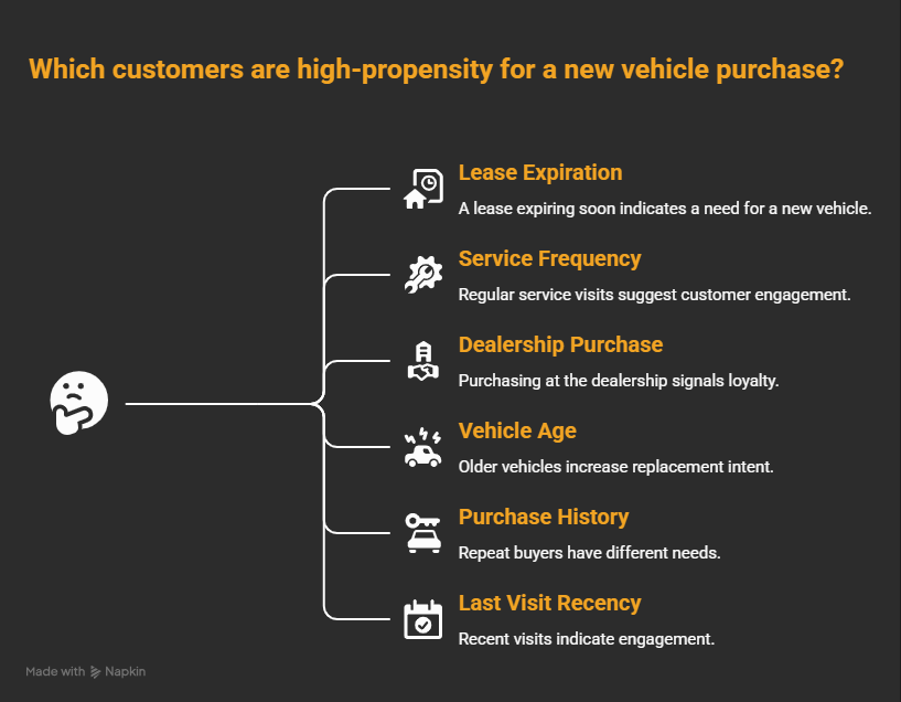 A customer with an aging vehicle, frequent service history, and an expiring lease is a very different prospect than a customer who just has an aging vehicle. Manual filters can't weigh that combination. A propensity model can.