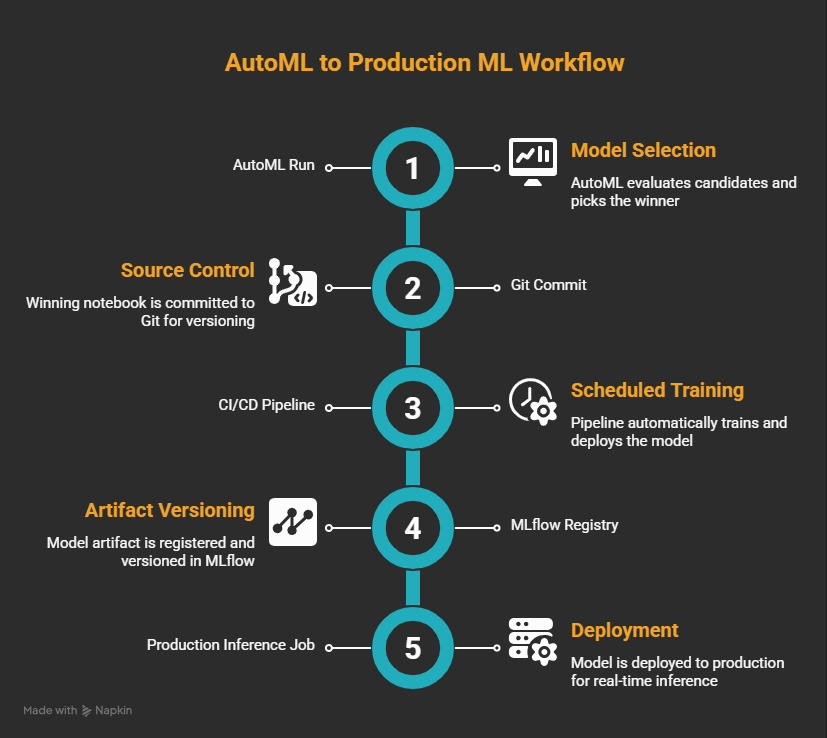 But here's where most ML projects actually die: AutoML produces a notebook. The notebook sits in someone's personal workspace. The model artifact lives in a personal MLflow experiment, not a shared registry. When retraining is due, someone does it manually. Three months later, no one remembers which version produced the current production scores.