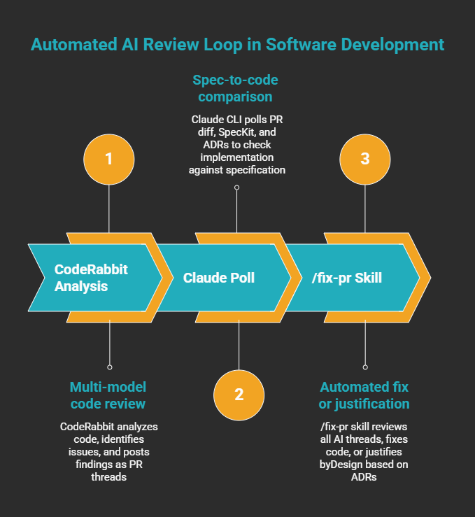 The Claude Poll runs on a cron job (Claude CLI, scheduled). It reads the PR diff, loads the originating SpecKit spec, and pulls all relevant ADRs. It posts its findings as PR threads. But its question is different: not "is this good code?" but "does this implementation match what was specified?"