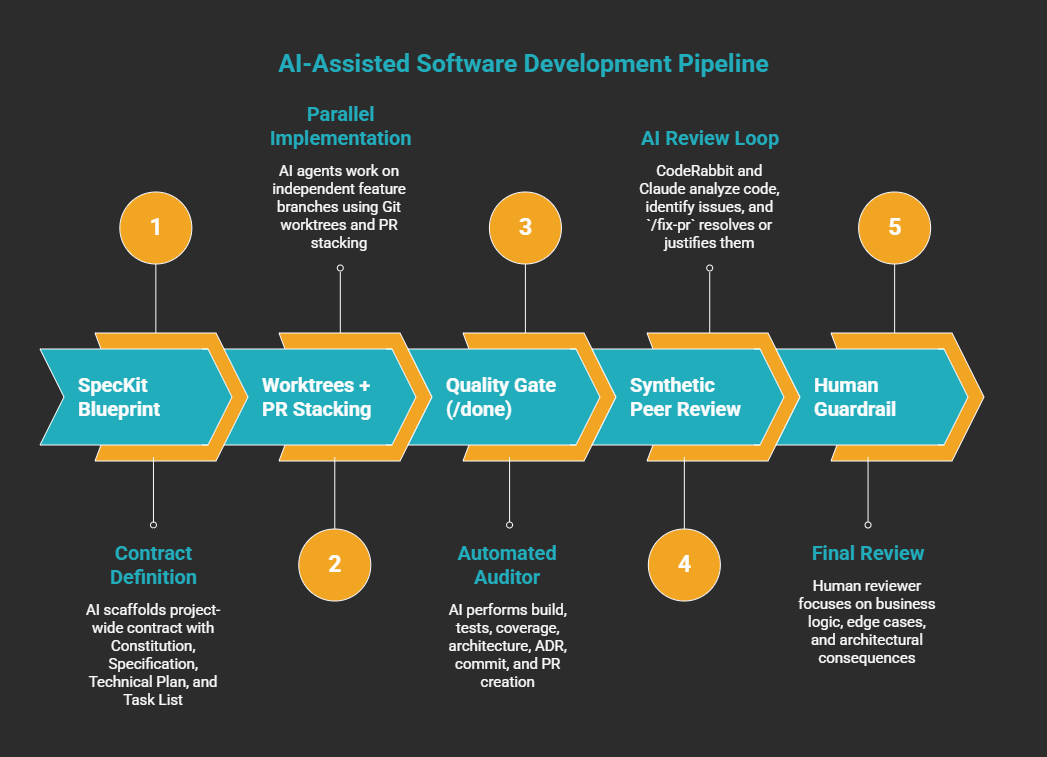 How a five-phase AI-assisted SDLC pipeline (SpecKit, Git worktrees, /done, Claude Poll, /fix-pr) enforces architectural discipline at speed without the AI sprawl.